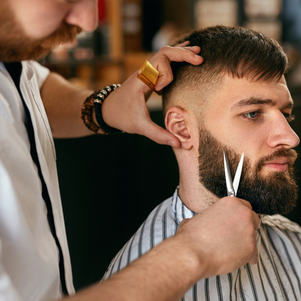 Ela pintou o cabelo. - He’s having his beard trimmed.